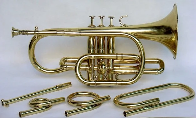 Florentine Besson’s description of her new trumpets and cornets in the 1867/1872 patent can be understood to express her ideas of what will find an edge in the competitive marketplace. She may be equivocal in much of this text, but very clear on the importance of proportions, notwithstanding forms. Her “trompette-cornet” in figures 1 through 12 above, she describes as preserving the tonal qualities of a simple (valveless) trompette d’harmonie, the natural trumpet that was used for playing musical pieces along with other instruments rather than the trompette d’ordonnance, which is strictly a signal instrument. She allows that it can be played with a cornet mouthpiece adapted to fit the trumpet mouthpipe, but maintains the basic character of the trumpet. The contrast may seem slight, but she states that her “cornet-trumpet”, figures 37, 38 and 39, has proportions that allow use as a trumpet with cylindrical crooks with trumpet mouthpiece and as a cornet with conical crooks with cornet mouthpiece. Unfortunately, none of these instruments are available to measure and compare, but we can at least make a start in this project by comparing the 1891 Bb trumpet featured above to cornets and other trumpets. Even if it has a different bell design than any of the three cornet-trumpets, it can be seen as the next iteration of Besson’s cornet-trumpet.