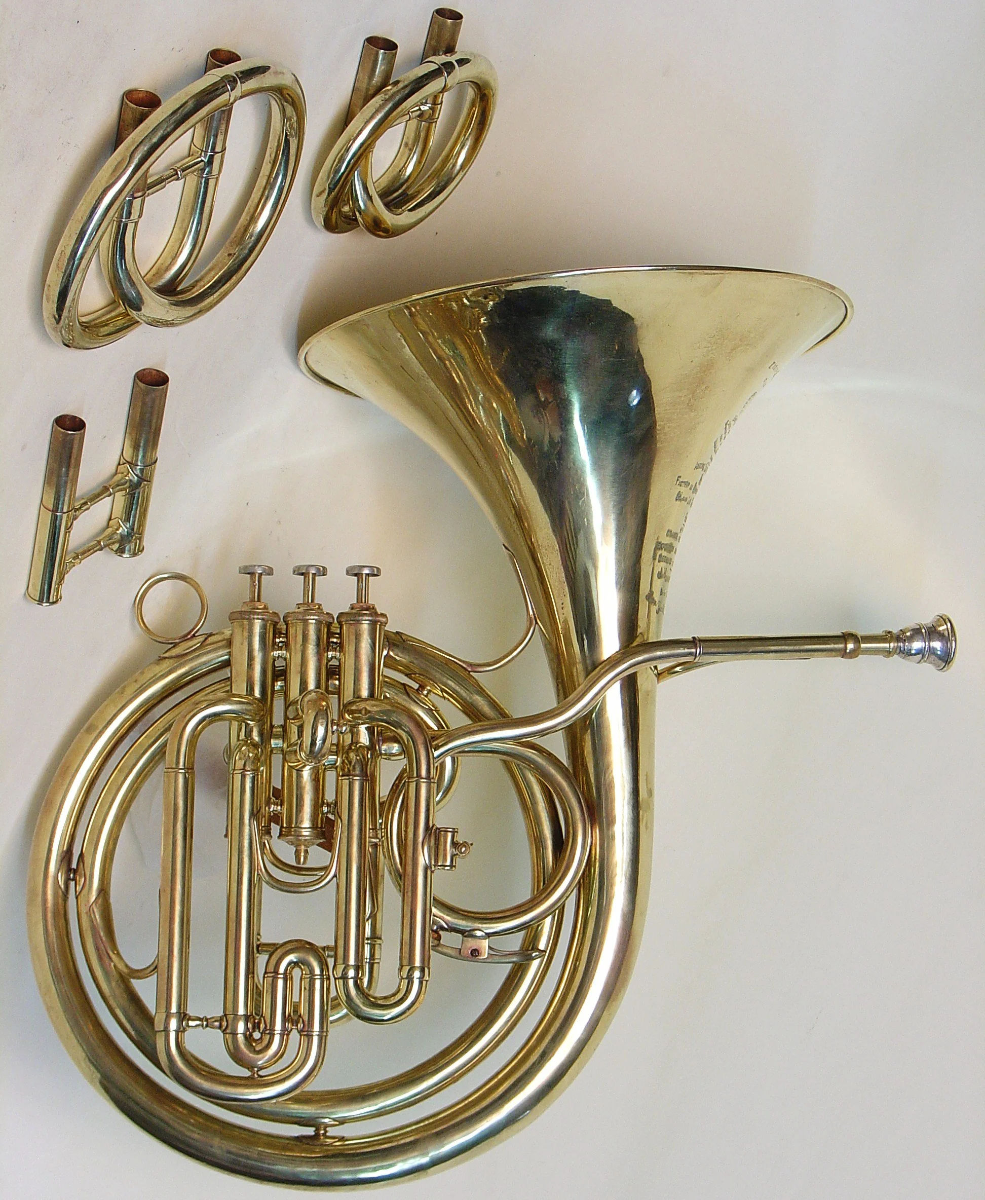 Crooked in C, the player could play along with piano or organ music in the home parlor or church. Most of these are more tenor horn in character in contrast to the Courtois, with smaller diameter tubing through the mouthpipe and valve section and bell flare akin to the French horns, it is very much like a French horn in its sound. This sound quality is, of course also determined by mouthpiece choice and player. I don't have the original mouthpiece, but I was able to locate a small diameter French alto horn mouthpiece with a very deep cup on which somebody had already filed down the shank to fit a smaller receiver. I believe that this is similar to the original mouthpiece.