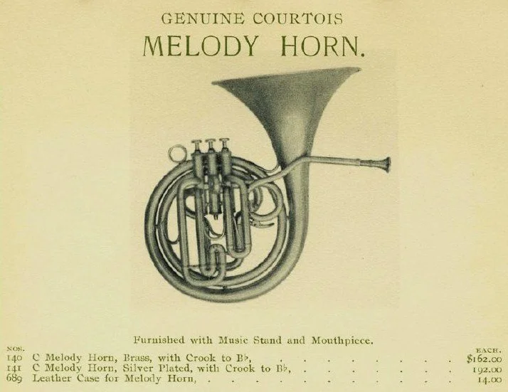 Listing for Courtois Melody Horn in J. Howard Foote’s 1897 catalog with no mention of those in F and Eb.