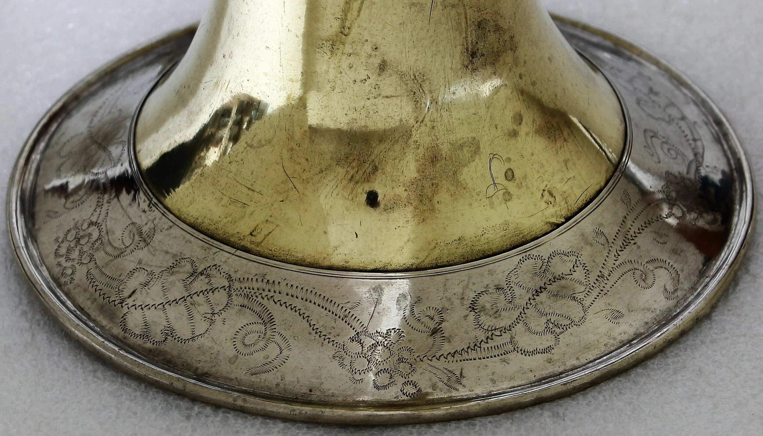 The fact that this trumpet is not signed by a maker and has typical oak leaf and acorn engraving, executed by a low skilled engraver on the nickel silver kranz or garland, make it very likely that it was made by a second tier or less established maker in Markneukirchen in Saxony, where the largest number of brass instruments were being made in proto-Germany at the time. Presumably, it was much less expensive than a three valve trumpet made by a better known maker. My guess is that it was made in the 1840s, or as late as the early 1850s for a trumpet player that didn’t need the most up to date orchestral trumpet.