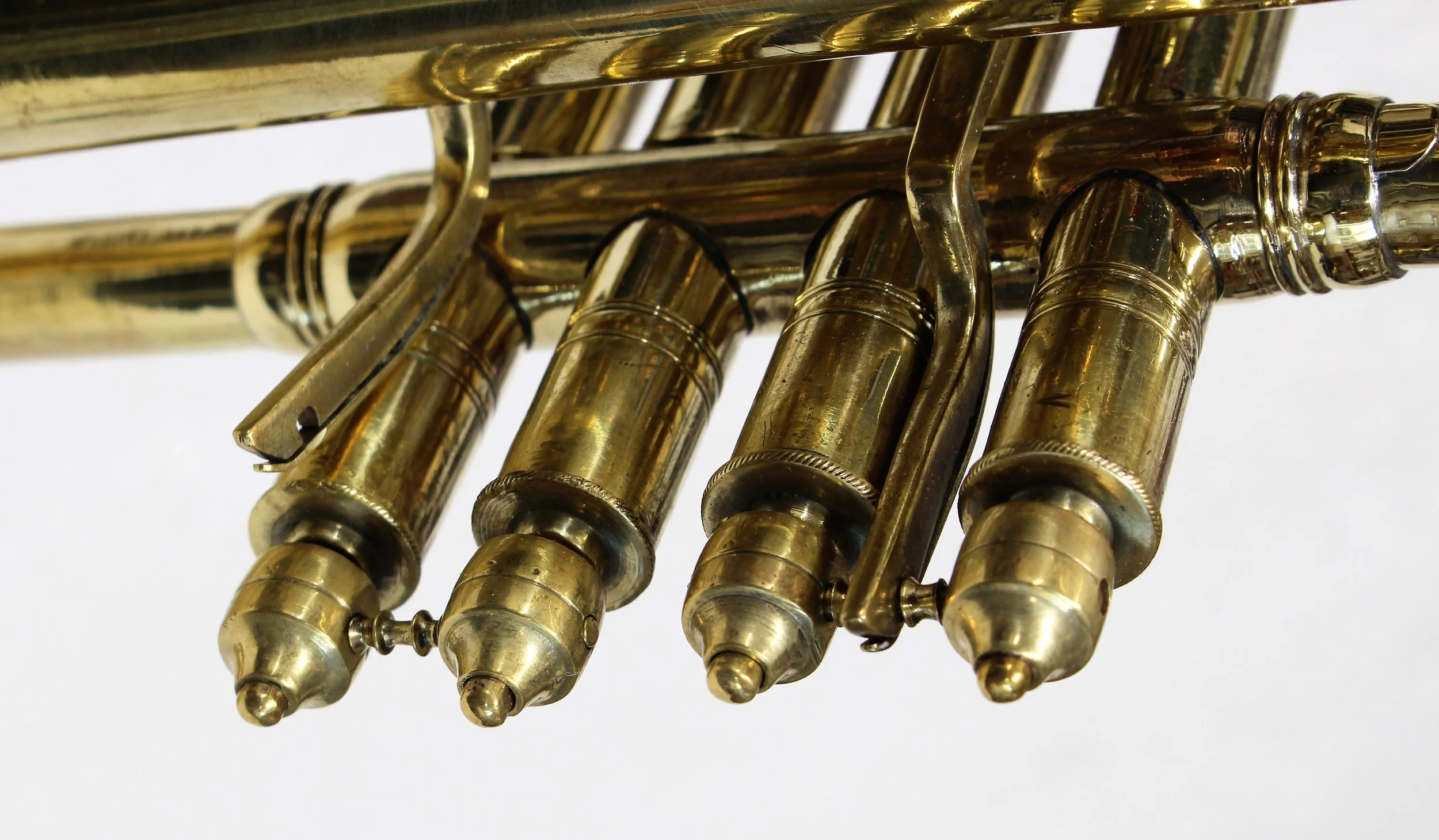 This style of trumpet was made as early as 1830 by Leopold Uhlmann, developed and improved from earlier double piston valve designs by Christian Sattler and Joseph Riedl. At the time, there were many more players of natural trumpets, horns and keyed bugles. The the third valve would add complications to the new system and was not used much in the lower pitched trumpets that played in the higher harmonics. Most were pitched in G or F with crooks for lower pitches, typically to Bb (an octave below this). Much less common are very early German trumpets in Bb like this one or Ab.