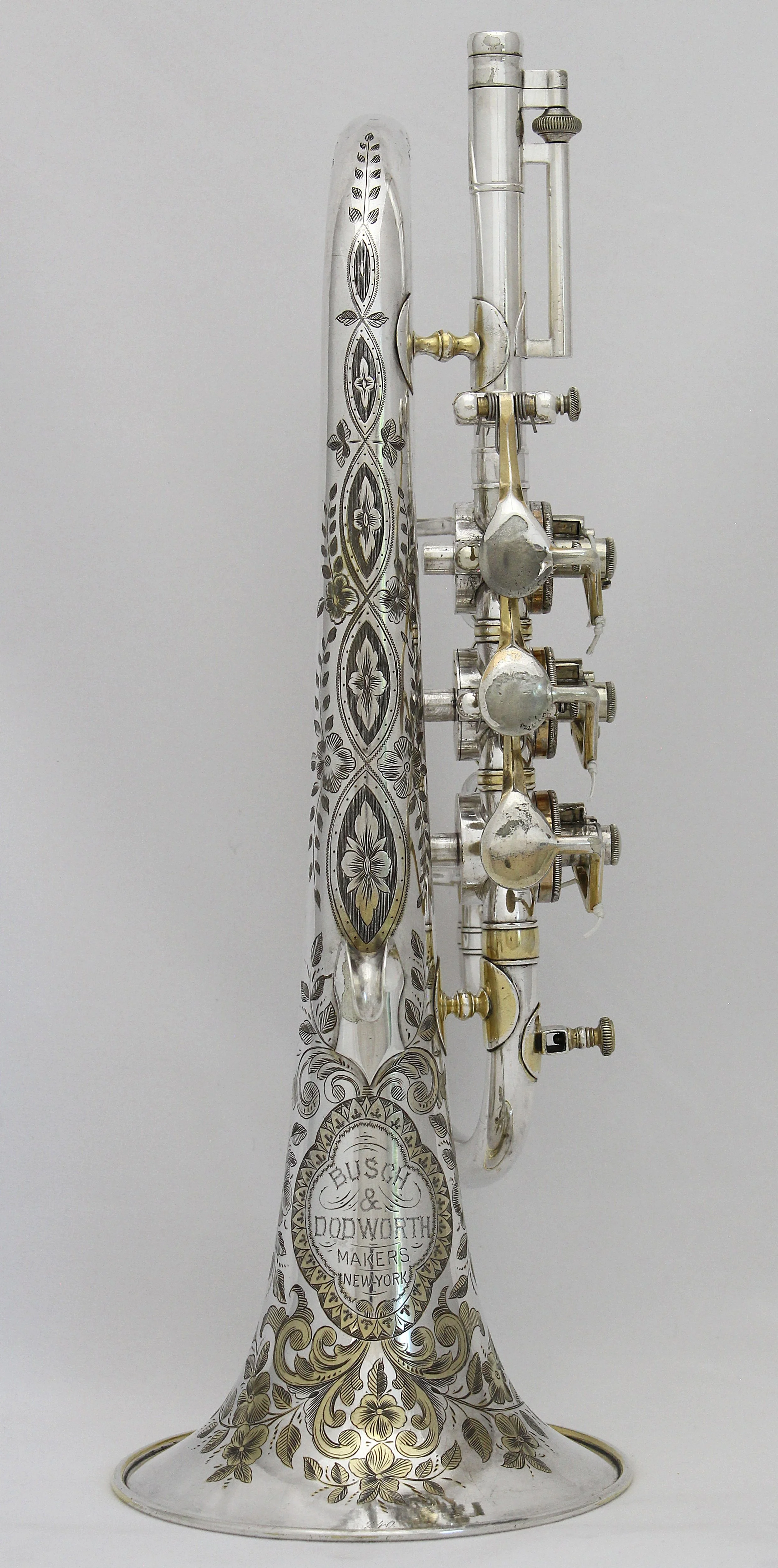 Pictured below is the only known example of an instrument marked “Busch and Dodworth”. It’s an Eb soprano cornet with bell proportions larger than more popular examples of the time, but smaller than the rotary valve bugles/saxhorns that were popular twenty years earlier. It appears to be custom built by Frederick Busch using a valve assembly from Boston. The style of rotary valve cornet was at least ten years out of vogue by 1880 and the catalog described above has no indication that instrument were available with rotary valves. It’s a bit of a show piece, with extensive and good quality engraving, silver plated and with gold plated trim.