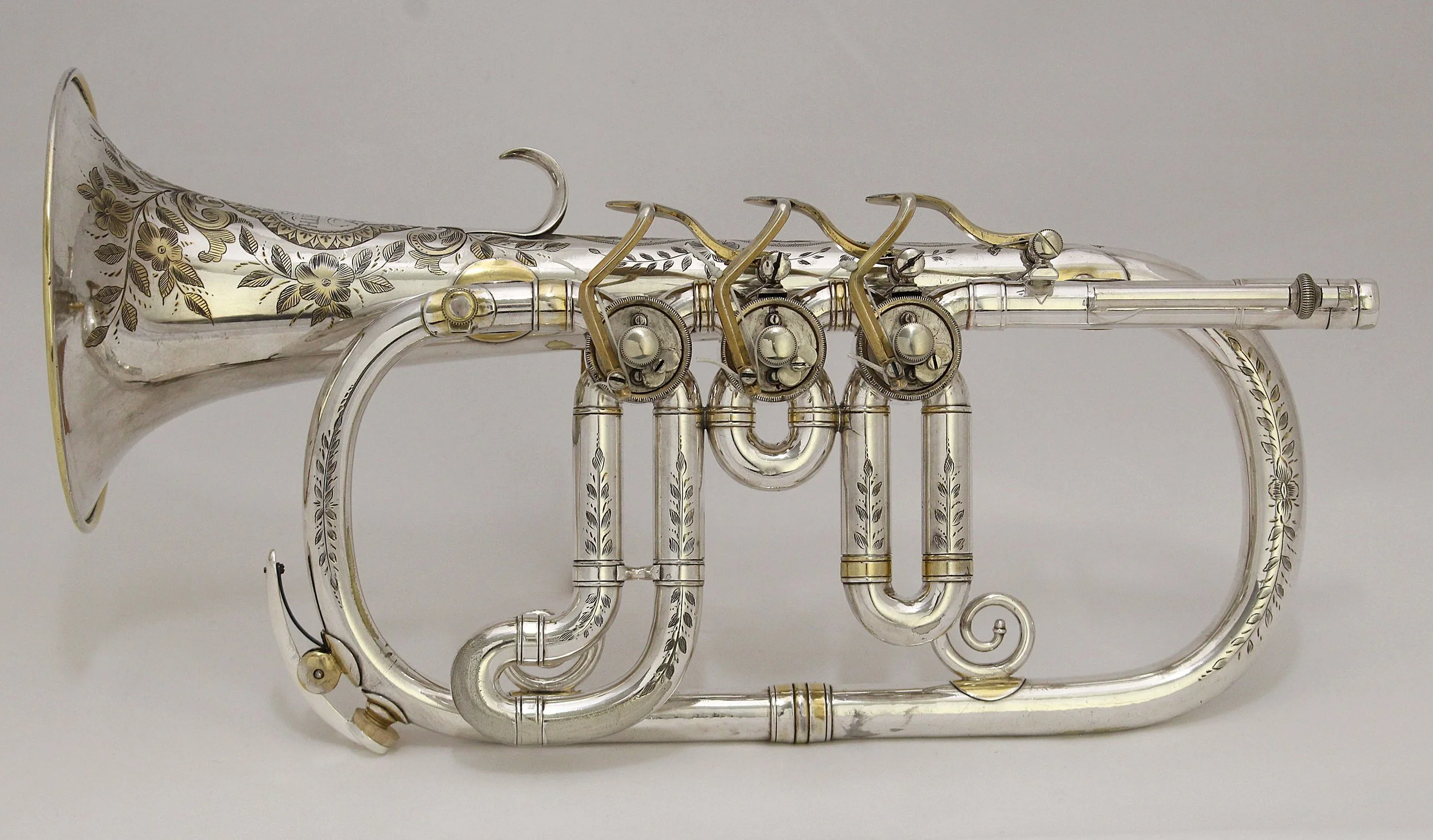 Brass instruments with Perinet valves were much less commonly used in the US in those years, but a number of examples, known to have been sold new, were made in Paris by Gautrot. I can't say for sure what the difference was between "Sax Horns" and "Ebor Cornos", but I believe that the latter were more cornet proportions compared to the valve bugle or flugelhorn proportions of the former. Today, this difference would be illustrated by the difference between a euphonium and Bb tenor or baritone horn, or even a valve trombone. As far as we know, the term “ebor (or eber) corno” was invented by the Dodworths and also used names such as “neo cor”, “trombacello”, “corino” and “cornetino”.