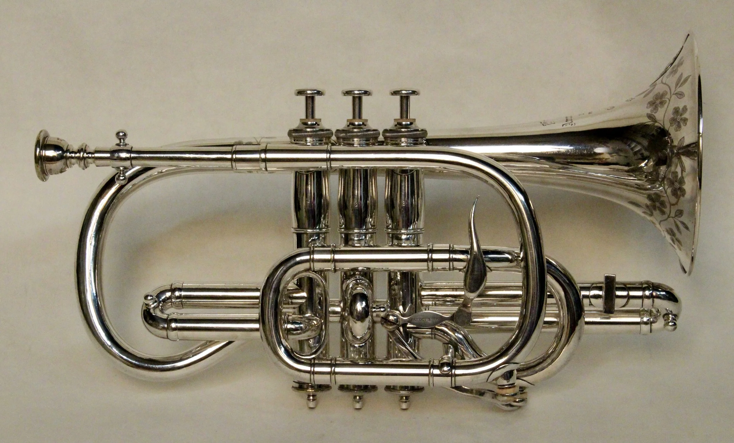 Comparing this valve section to Courtois cornets of the time, the stems, buttons and top and bottom caps are interchangeable and piston diameters are also the same. This is the same situation as in the piston valve Fiske cornet featured on this site and several other makes that I have examined. Courtois instruments were always much more expensive than the competition and it seems unlikely that they would have had the excess production to manufacture valve sections for other makers. Another possibility is that Courtois was contracting for the supply of these assemblies from another maker, who was also supplying other makers including Fiske and Hutchins.