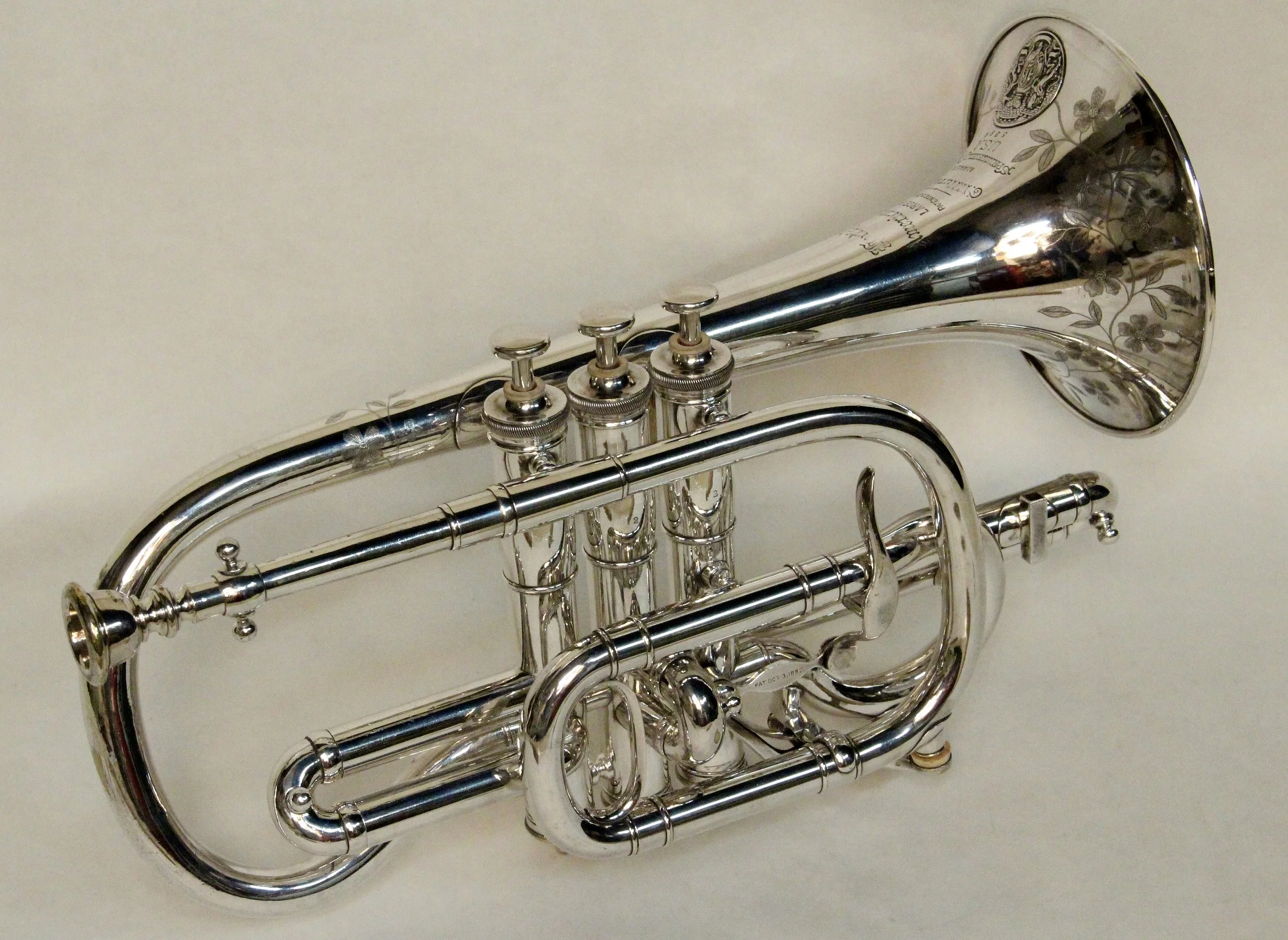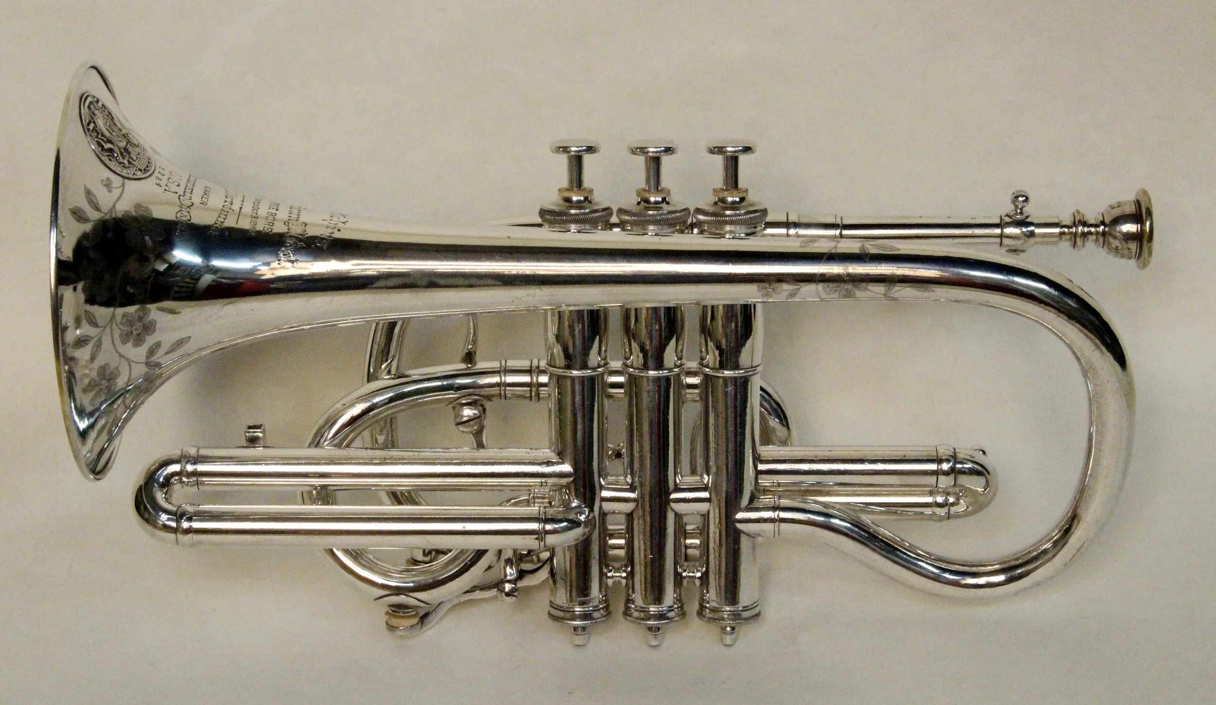 Heald contracted with the 22 year old C.W. Hutchins in May of 1882 to manufacture band instruments and assigned the rights to the patent for his waterkey to that business. This was two months before applying for the patent, but the confidence of the two men proved fruitful. Heald later wrote that this model cornet was produced from 1882 until 1888. Prior to hiring Heald, Hutchins may have been selling imported brass instruments. There is at least one Hutchins cornet known (in the Pinardi collection) without this patented waterkey or the royal looking embossed shield and likely predates these.