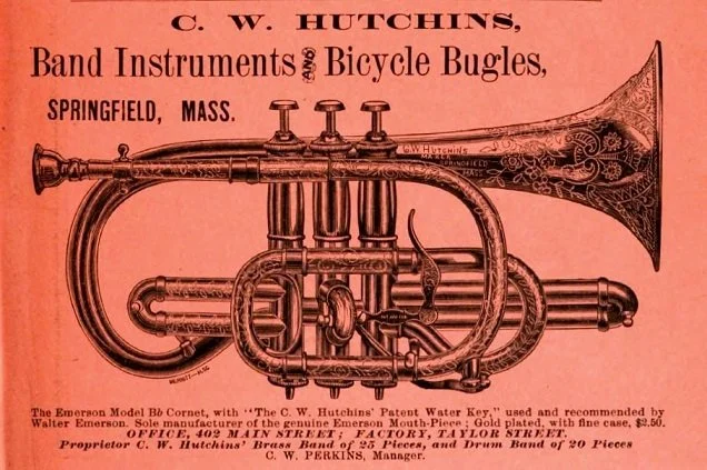 Hutchins also offered bicycle bugles in finishes ranging from plain brass to burnished gold plating, fully engraved and set with precious stones. This was the height of the bicycle craze and bicycle clubs were even more common than brass bands. The advertisement shown here is from the Pinardi collection.